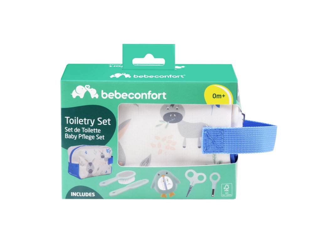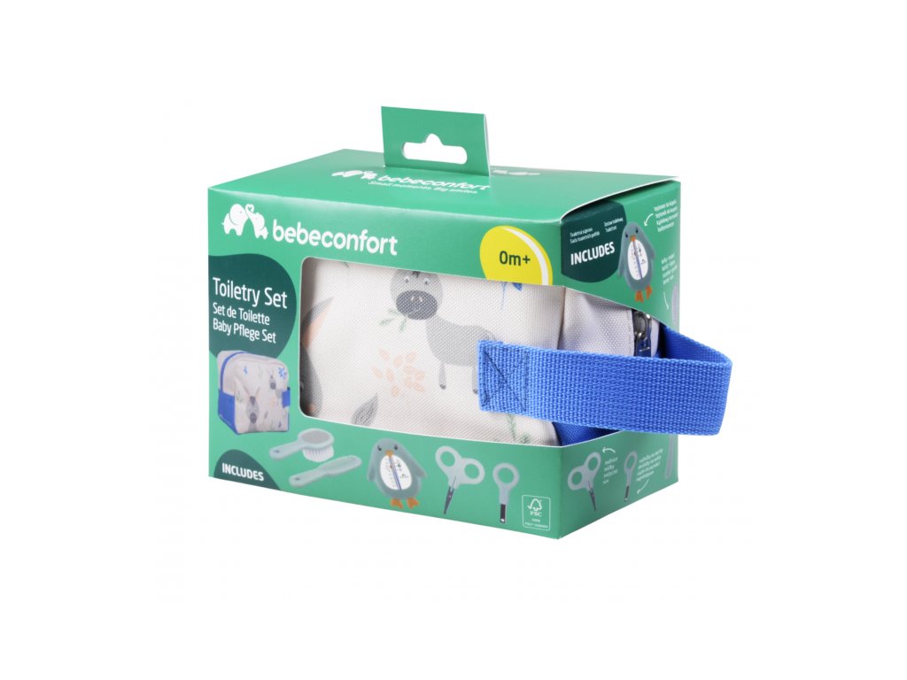 Toaletní pouzdro Bebeconfort obsahuje pět základních doplňků pro hygienu a péči o dítě v kvalitním provedení: teploměr do vody, nůžky a kleštičky na nehty, kartáč na vlasy se zrcátkem a hřeben.