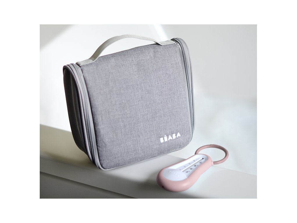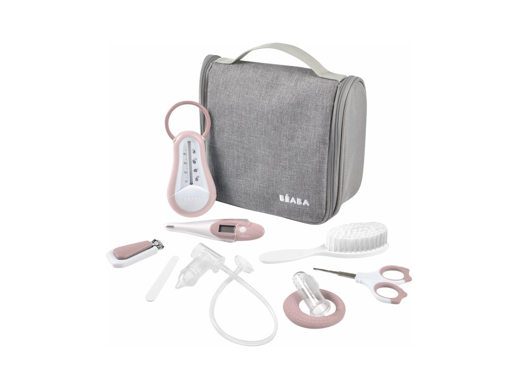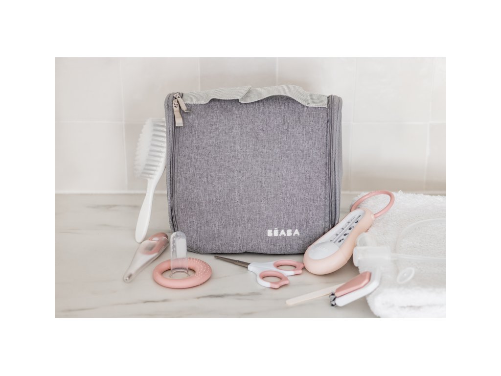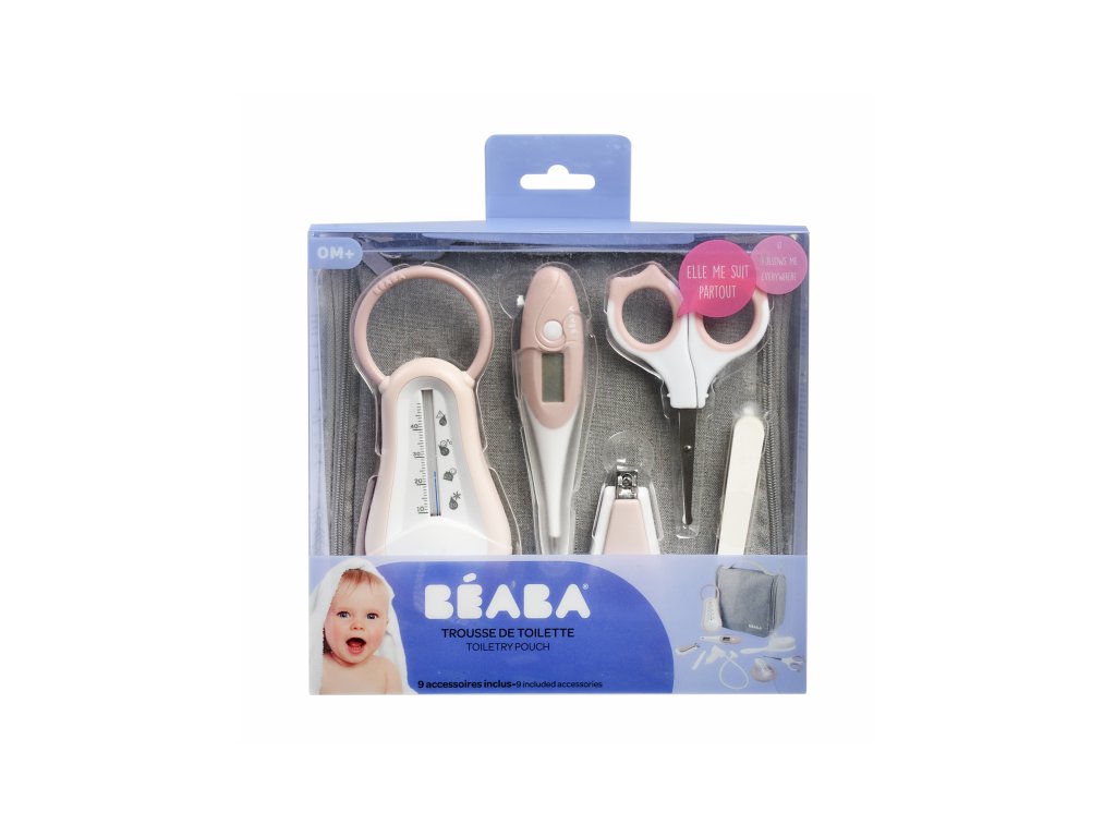 Závěsné toaletní pouzdro Beaba obsahuje devět základních doplňků pro hygienu a péči o dítě v kvalitním provedení: teploměr do vody, digitální teploměr, nůžky a kleštičky na nehty, kartáč na vlasy, kousátko, masážní kartáček na dásně, odsávačku hlenů a pilník na nehty.