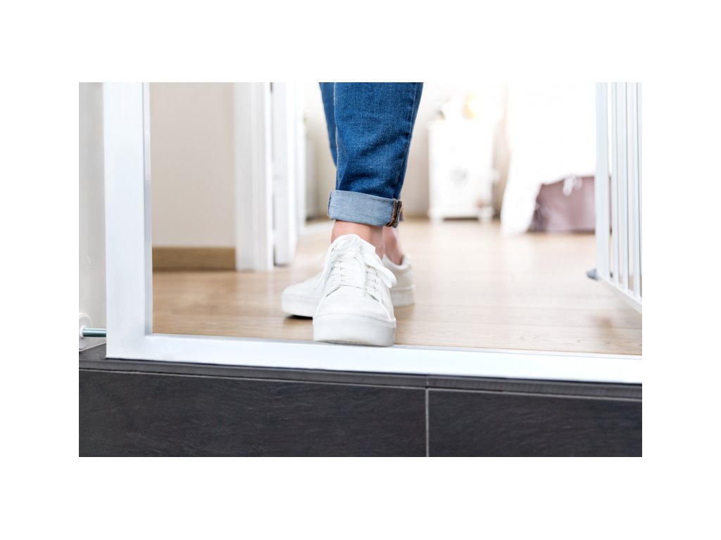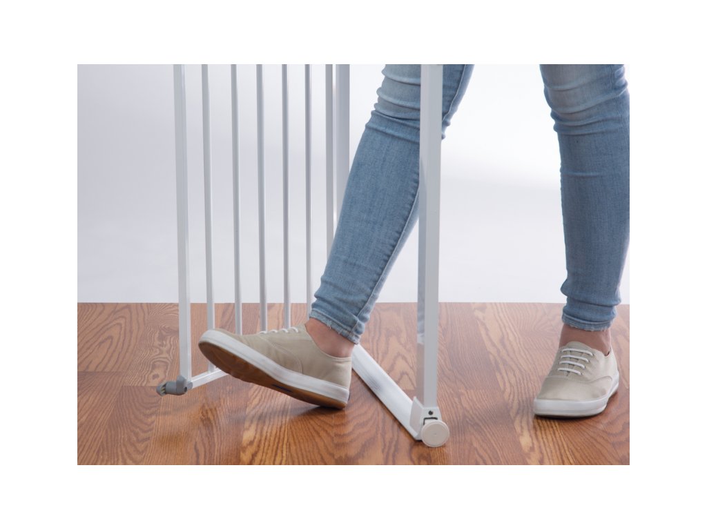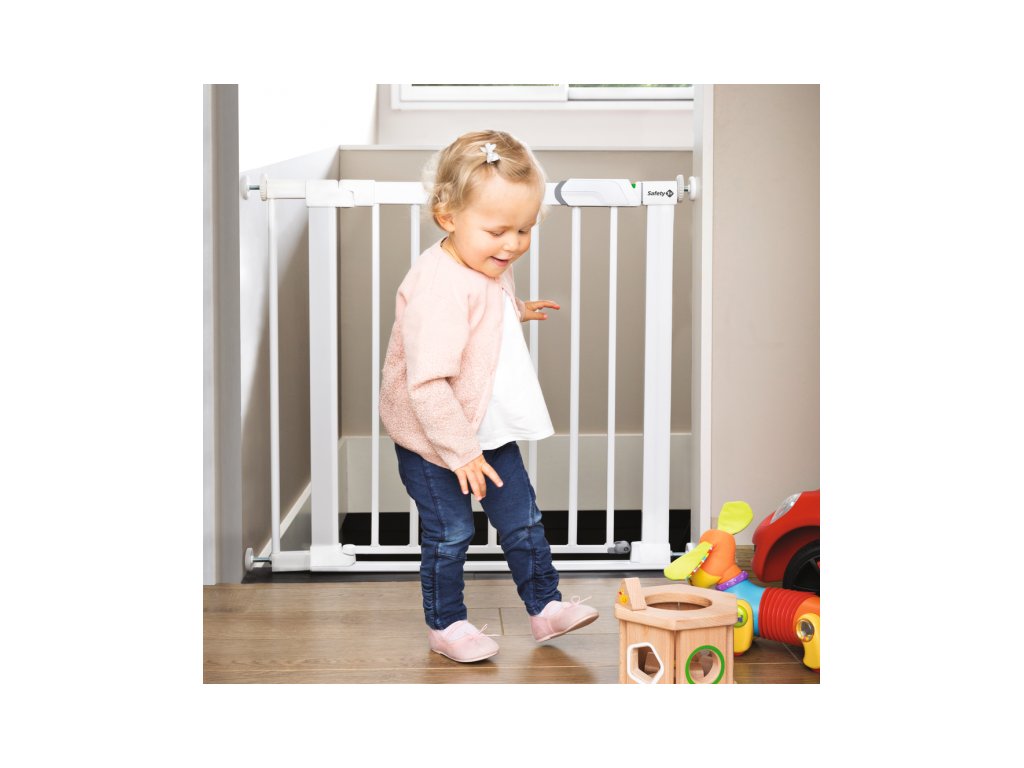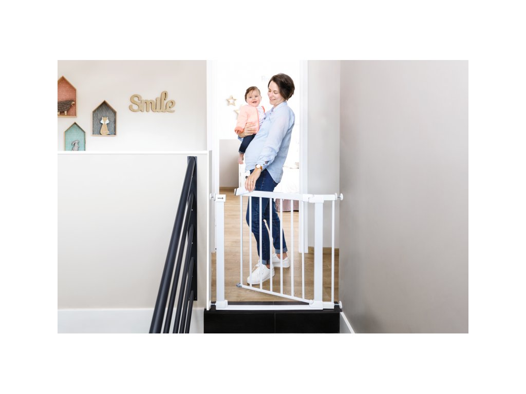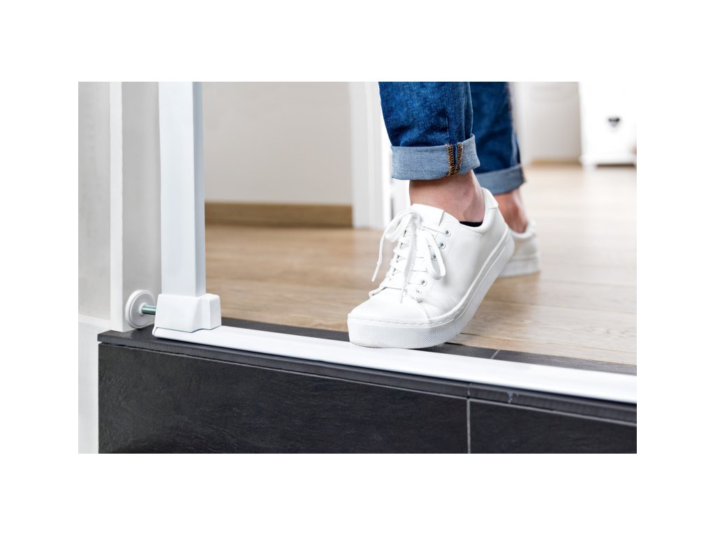 Zábrana Safety 1st Flat Step poskytuje novou úroveň bezpečnosti mezi schodišťovými zábranami se svorkovými úchyty. Zatímco většina standardních zábran má 3 cm vysoký práh, zábrana Flat Step s ultra-plochým podlahovým systémem umožňuje bezpečný průchod a tím eliminuje riziko zakopnutí. Zábranu snadno otevřete zvednutím rukojeti a zavřete jednoduchým stiskem. Indikátor Secure Tech® ukazuje, zda je zábrana bezpečně zajištěna. Zábranu lze otevřít oběma směry a pokud jsou děti mimo domov, může být stabilně v otevřené poloze. Je vhodná do dveří či prostoru mezi stěnami o rozměrech 73 cm až 80 cm a lze ji rozšířit pomocí samostatně dostupných prodloužení až na 101 cm.