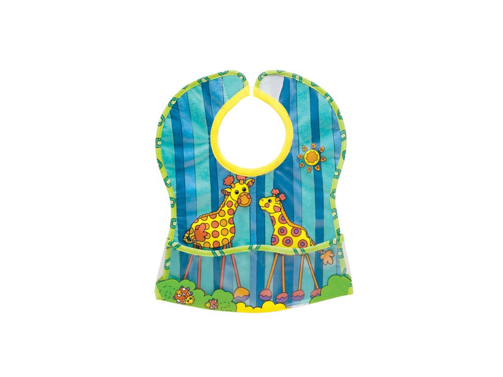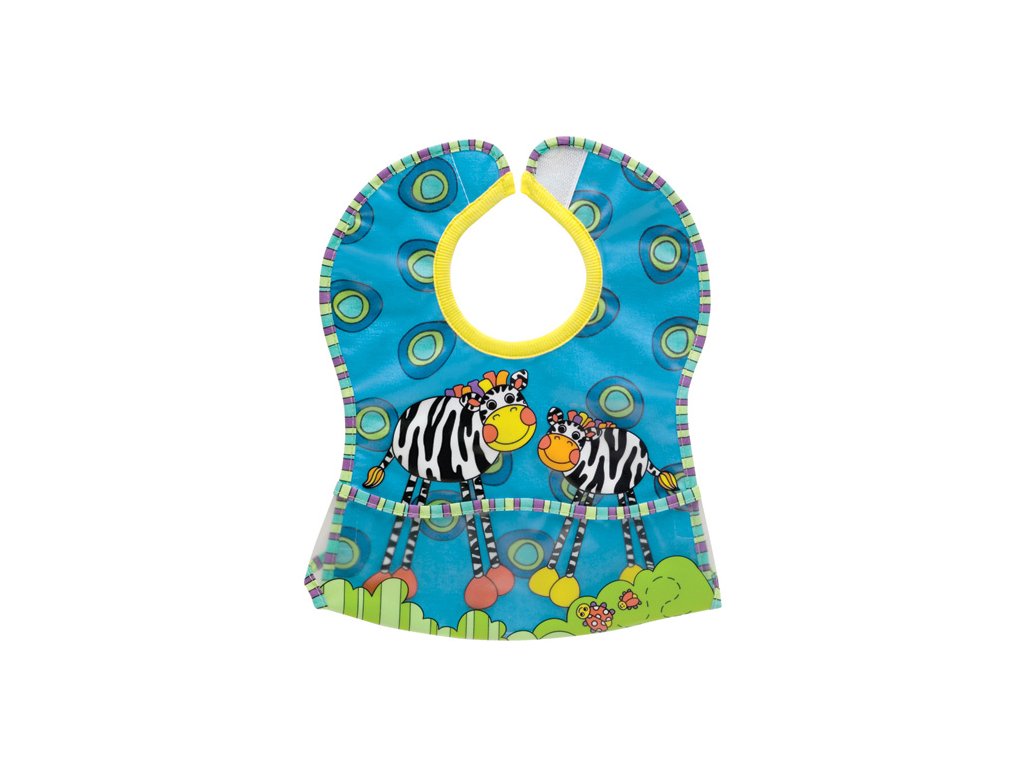 Barevný bryndáček Sassy má kapsičku na zachycování drobečků a stékajících potravin. Strany kapsičky se dají odepnout pro snadné čistění. Vrchní strana je omyvatelná, spodní strana je z měkkého froté.