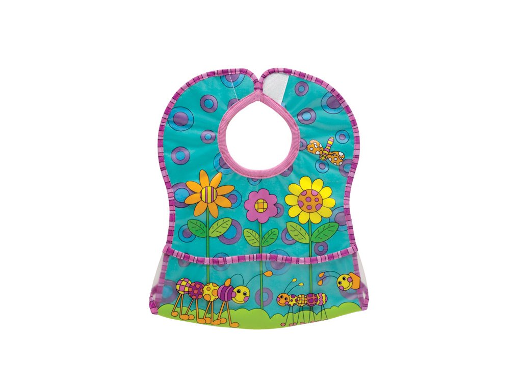 Barevný bryndáček Sassy má kapsičku na zachycování drobečků a stékajících potravin. Strany kapsičky se dají odepnout pro snadné