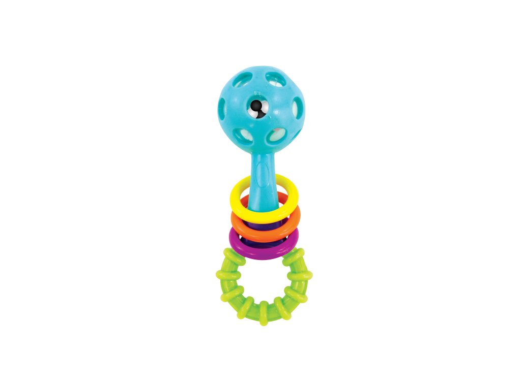 Korálky uvnitř míčku a kroužky na rukojeti při pohybu chrastí a lákají dítě ke zkoumání rukama i ústy.