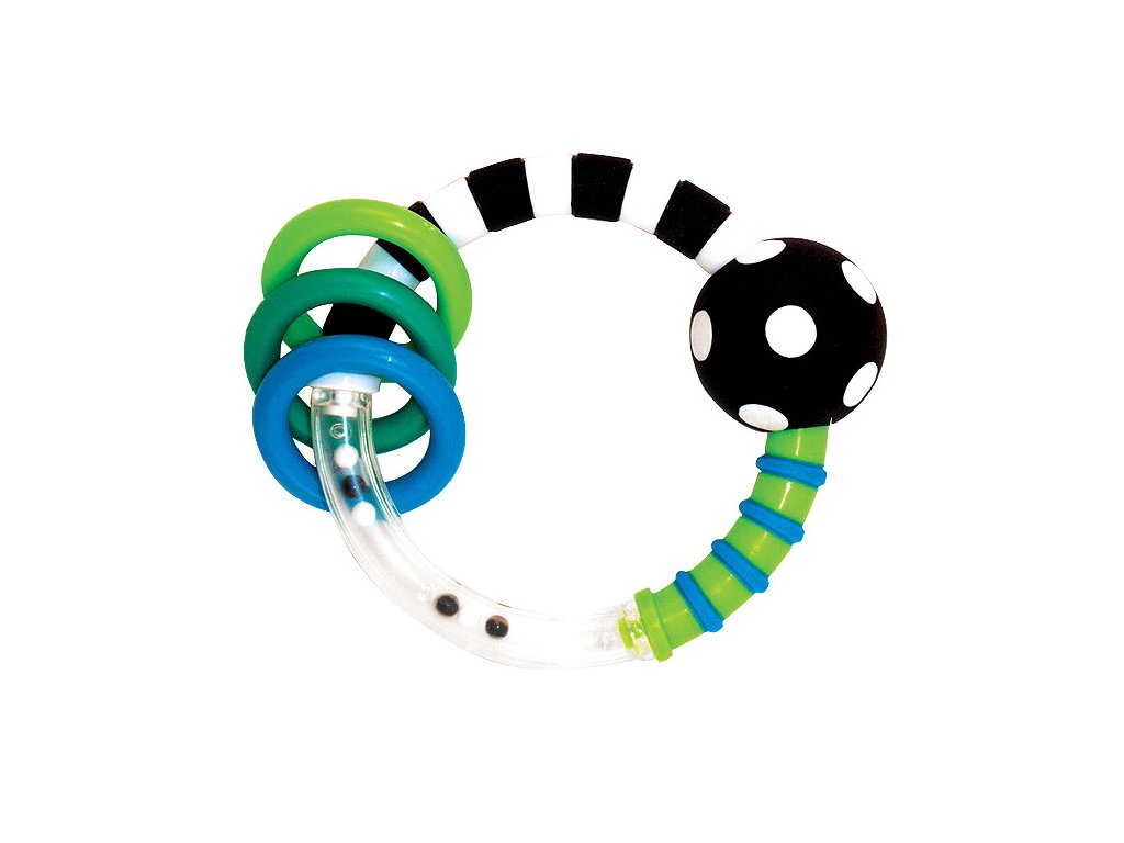 Chrastítko se čtyřmi specifickými texturami ke zkoumání. Vysoce kontrastní černá & bílá pomáhá dítěti zaměřit zrak na předmět. Tvar pro snadné uchopení rukou i ústy. Bez povrchových laků, bezpečné do pusy. Vhodné od narození.
