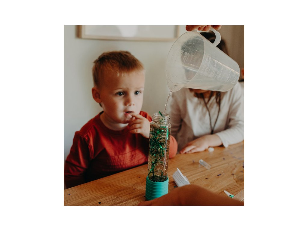 Stačí přidat vodu a trochu mycího prostředku a je připraveno! Díky této možnosti můžete znovu naplnit a znovu použít senzorickou láhev pro nekonečné hodiny zábavy.