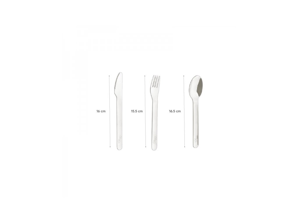 - Rozměry: 6,5 cm (lžička), 15,5 cm (vidlička), 16 cm (nůž)