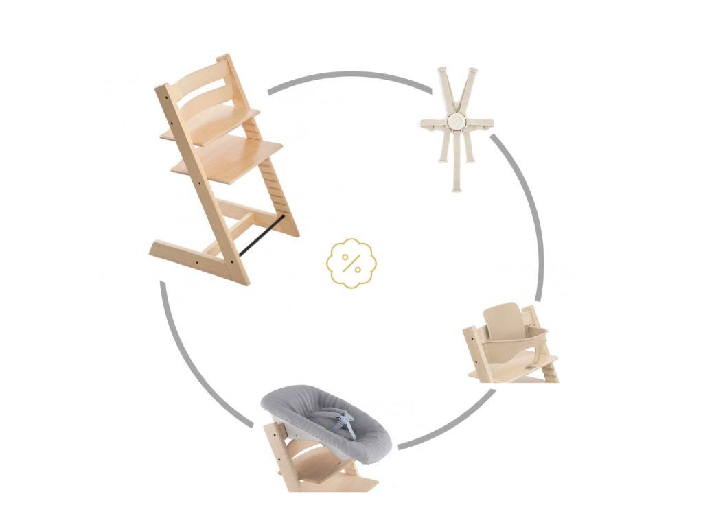 Zvýhodněný set dětské židličky Tripp Trapp včetně novorozenecké sady, Baby setu, pásů. Od narození až do dospělosti. Používání židličky Tripp Trapp zajišťuje správné a ergonomické sezení dítěte v jakémkoliv věku. Je vyrobena z evropského masivního dřeva a má prodlouženou záruku 7 let.
