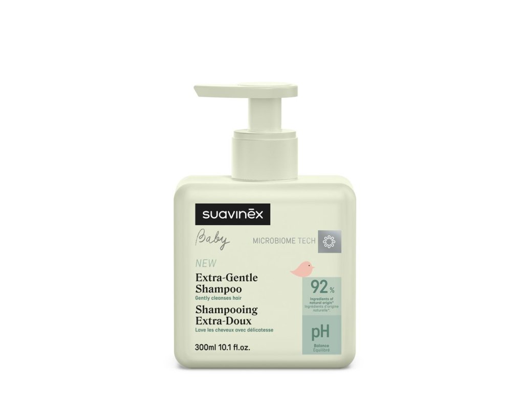 92% složek přírodního původu Součástí každodenní hygieny je i Extra jemný šampon z nové řady Suavinex, který šetrně myje a rozčesává vlasy , přičemž zachovává přirozenou rovnováhu vlasové pokožky. Vlásky zanechává lesklé, hebké a čisté . Jeho biologicky odbouratelné složení bez mýdla nezpůsobuje slzení očí a je ideální pro citlivou dětskou pokožku hlavy. Má jemnou, nevtíravou vůni a je dostupný v praktickém balení 3 00 ml .