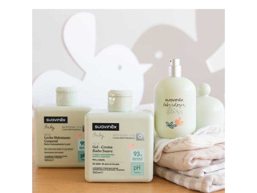 Jemný koupelový gel-krém Suavinex jemně čistí pokožku i vlasy miminka. Obohacen o pantenol (provitamin B5) pro ochranu proti vysušování a zajištění hebkosti vlasů.
