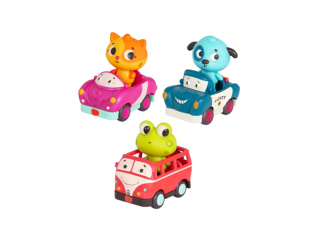 Veselá autíčka pro nejmenší mají roztomilé řidiče v podobě kočičky, pejska a žabičky.