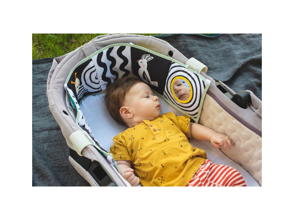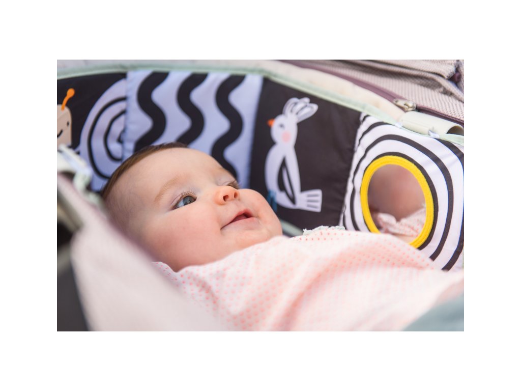 - 0-3 měsíce: strana s bezpečným zrcátkem a vysoce kontrastními obrázky v základních barvách, které podněcují rozvoj smyslů a emoční inteligence dítěte.