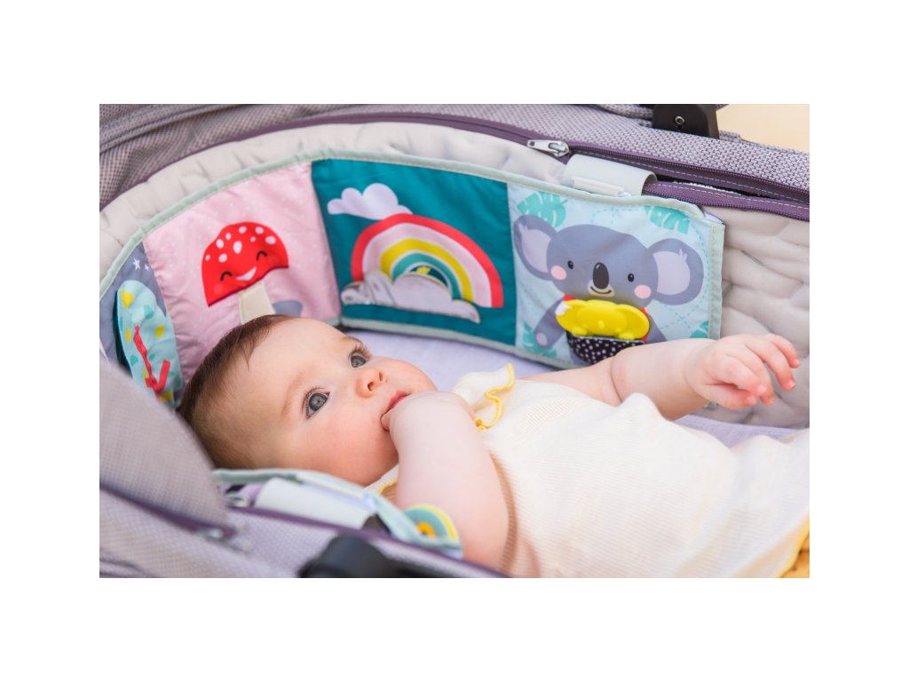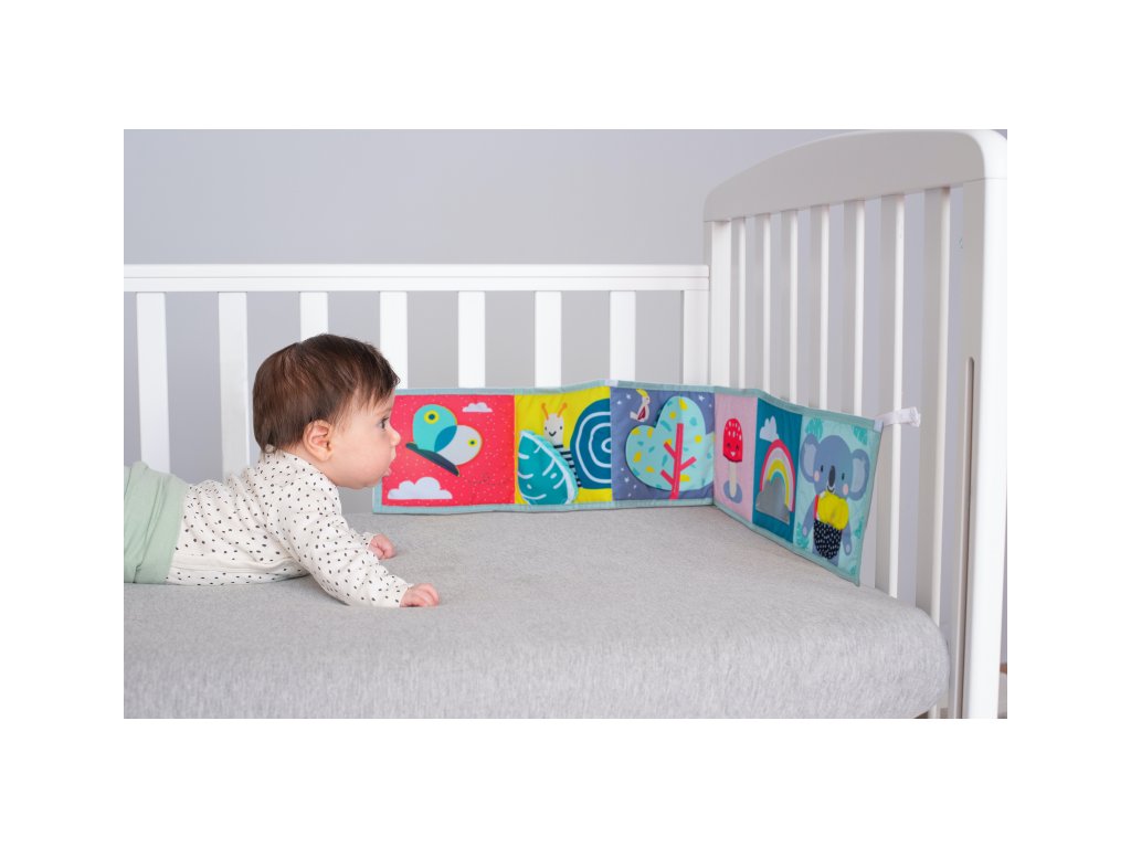 Knížka drží postavená samostatně nebo je možné ji připevnit pomocí plastových klipů na postýlku či do kočárku.