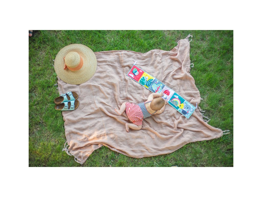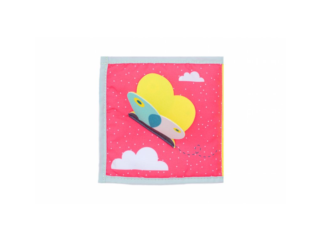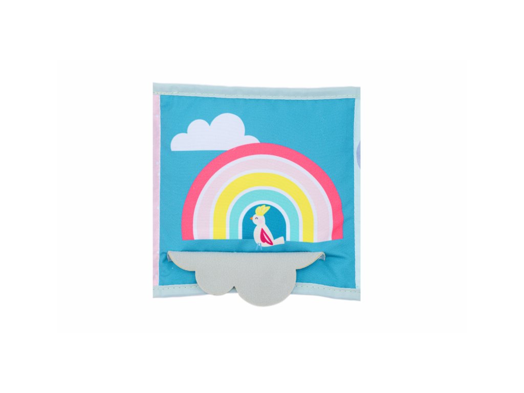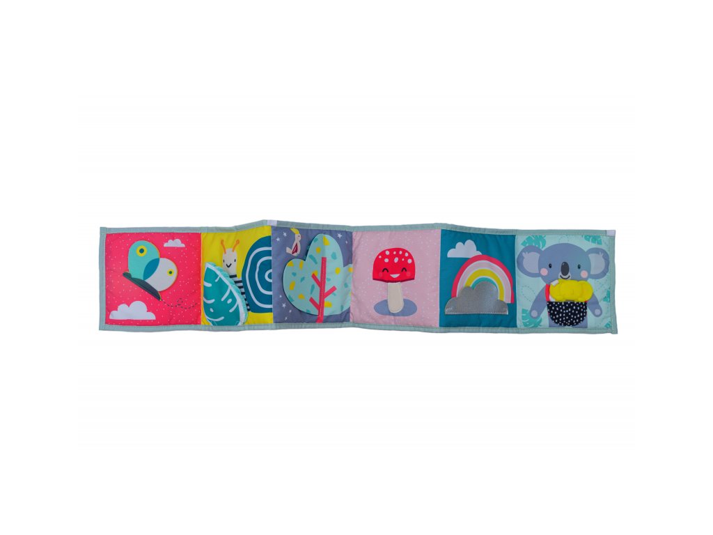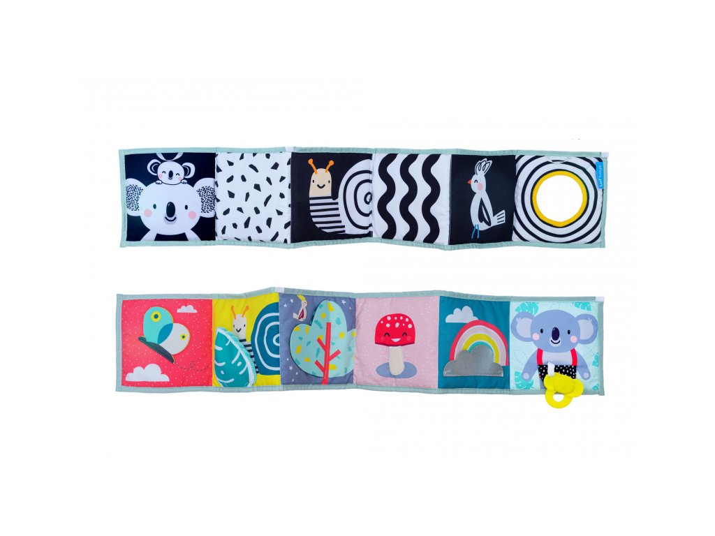 Oboustranná textilní knížka pro nejmenší je určena do kočárku, postýlky i na hrací deku.