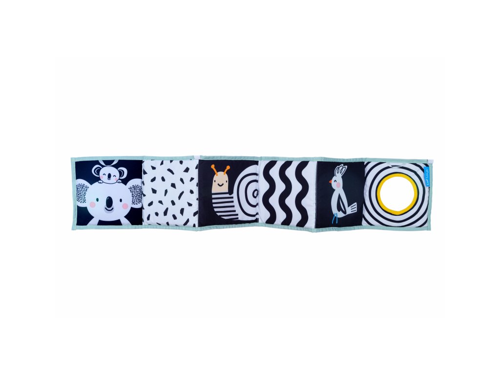 Oboustranná textilní knížka pro nejmenší je určena do kočárku, postýlky i na hrací deku. Kniha nabízí dvě strany pro dvě vývojová stádia dítěte: 0-3 měsíce: strana s bezpečným zrcátkem a vysoce kontrastním...