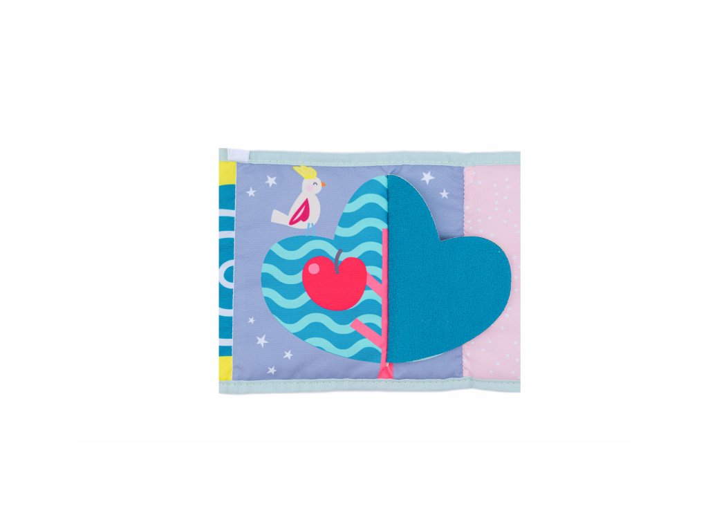 - Od 3 měsíců: strana s barevnými obrázky a různorodými texturami ke zkoumání, které podporují rozvoj smyslů a jemné motoriky dítěte.
