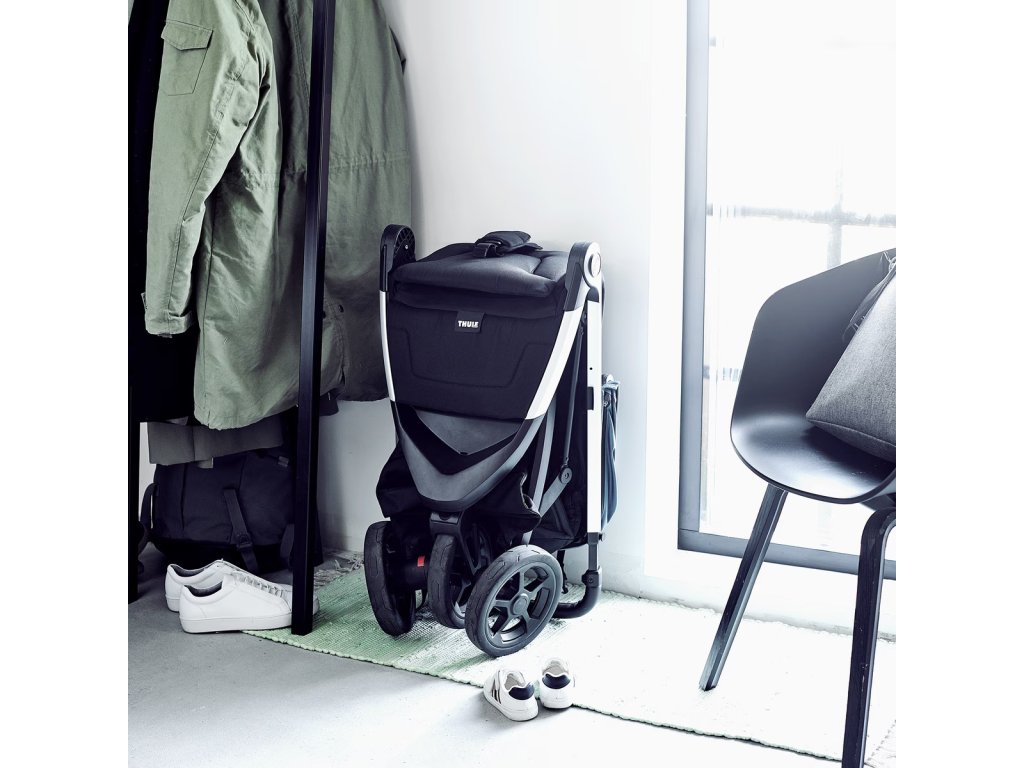 Snadno použitelná nášlapná nožní opěrka a sklopné sedadlo přizpůsobí kočárek Thule Spring potřebám vašeho dítěte od rána do večera.