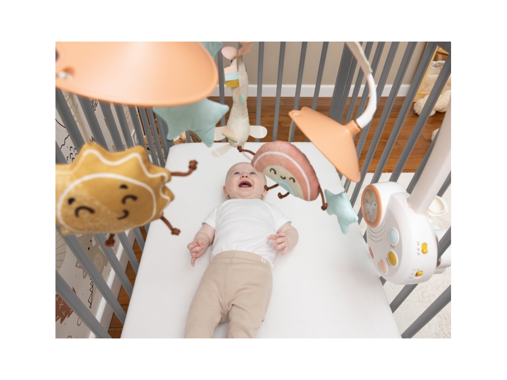 Kolotoč byl navržen s odborníky na vývoj dětí a podporuje rozvoj smyslů i emocí. Kontrastní černobílé spirály poskytují důležitou vizuální stimulaci pro rozvíjející se zrak, zatímco roztomilé plyšové postavičky povzbuzují dítě ke zvukovému projevu a emocím. Příjemná klasická hudba a tlumené noční světlo pomáhají klidnému usínání miminka.