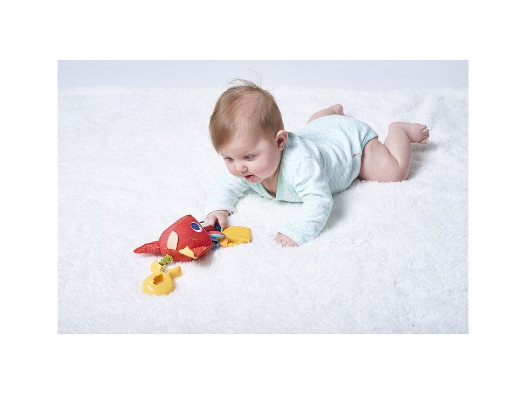 Součástí hračky je i kousátko, které pomáhá ulevit citlivým dásním dítěte při prořezávání prvních zoubků.