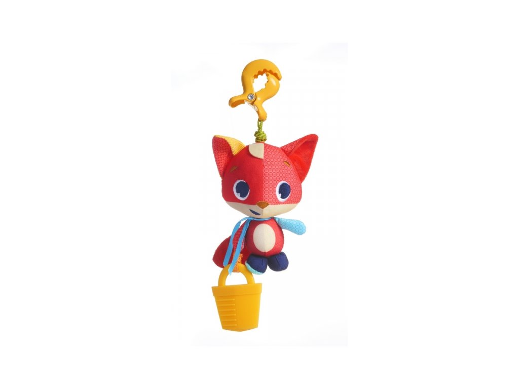 Měkká textilní hračka v podobě roztomilého lišáka chrastí a šustí a po natažení vibruje