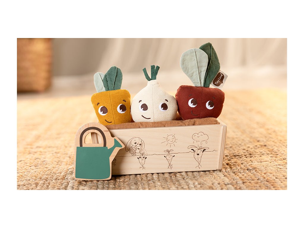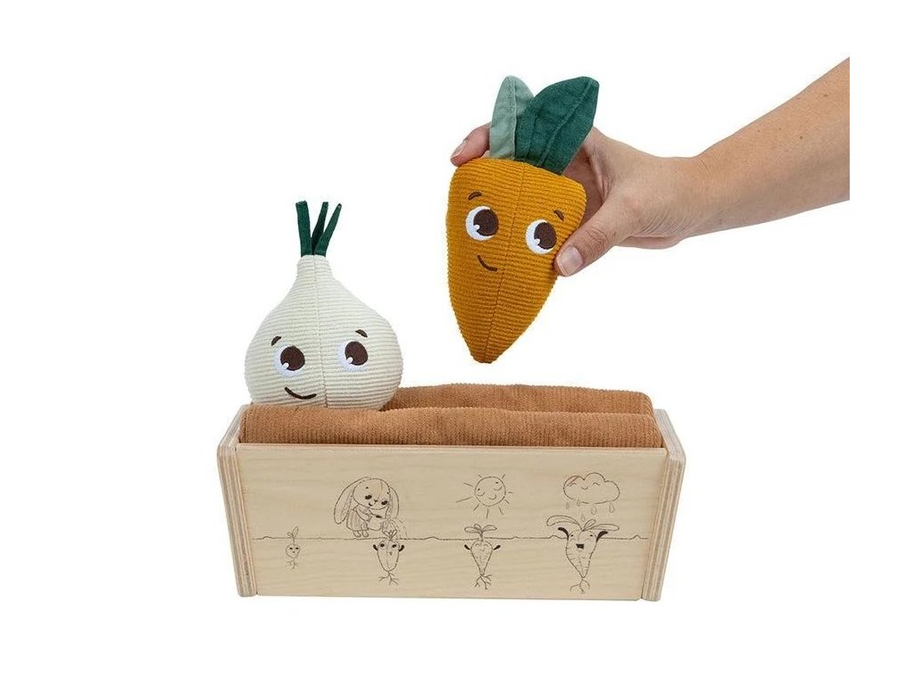 Zahrádku tvoří dřevěný truhlík, tři kusy zeleniny s veselými obličejí vyrobené z měkkého textilního materiálu a dřevěná konvička.