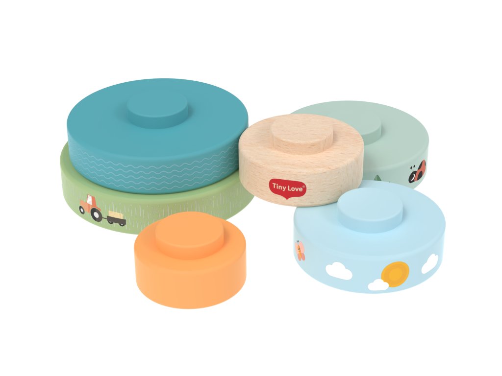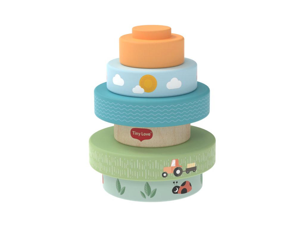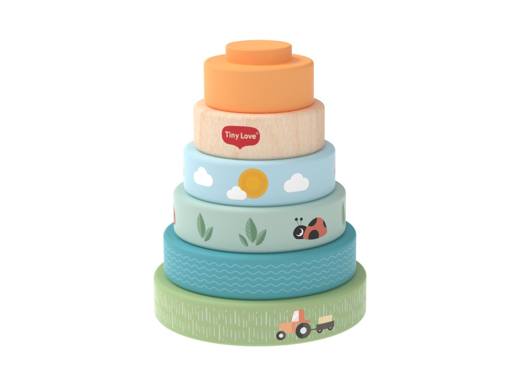 Dřevěné nasazovací kroužky Tiny Love nabízí různé možnosti hraní - děti je mohou nasazovat a stavět do věže, třídit podle velikosti, kutálet s nimi a postupně objevovat a rozlišovat barvy, velikosti a jednoduché souvislosti. Kroužky s krásným potiskem motivů ze života na farmě jsou lehké a dobře se drží i malými dětskými ručičkami. Hračka přirozeně rozvíjí jemnou motoriku, koordinaci ruka–oko i první logické myšlení.