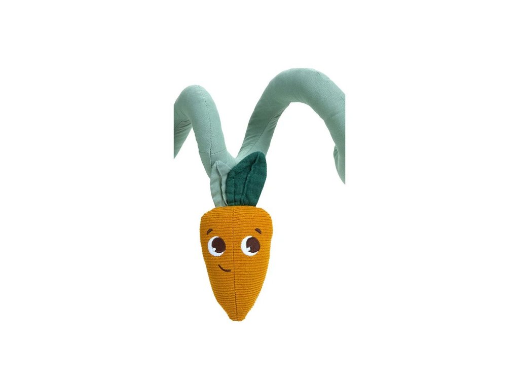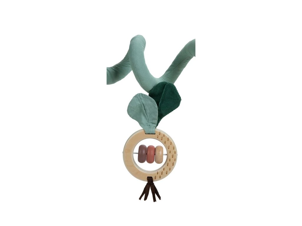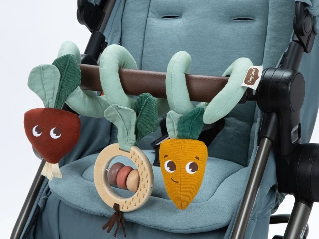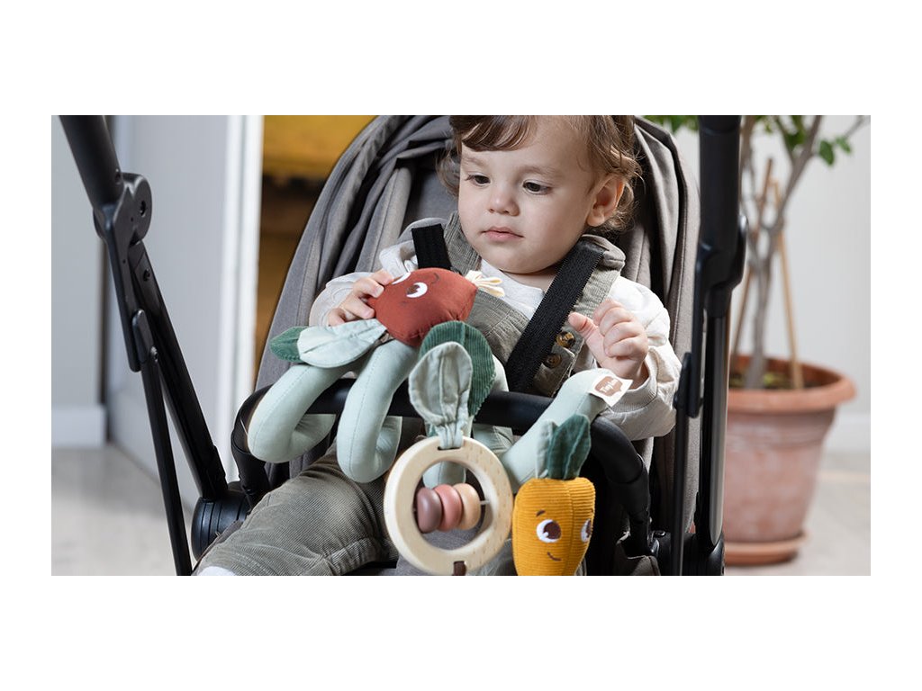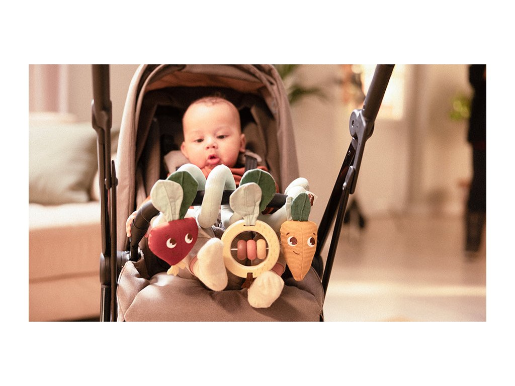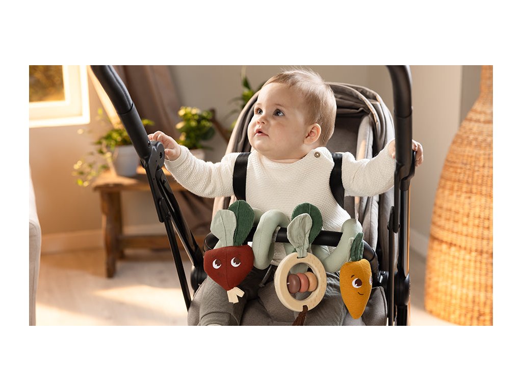 Spirála na kočárek Tiny Love navržená s láskou a péčí odborníky na vývoj dítěte zabaví vaše dítě během procházek s kočárkem. Nabízí různorodé aktivity, které poskytují smyslovou stimulaci a rozvíjejí jemnou motoriku. Pozornost dítěte upoutá dřevěné chrastítko s korálky a strukturovanými lístky, řepa s bavlněnými stužkami a listy i mrkvička z manšestru s bavlněnými lístky.