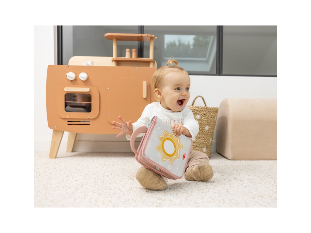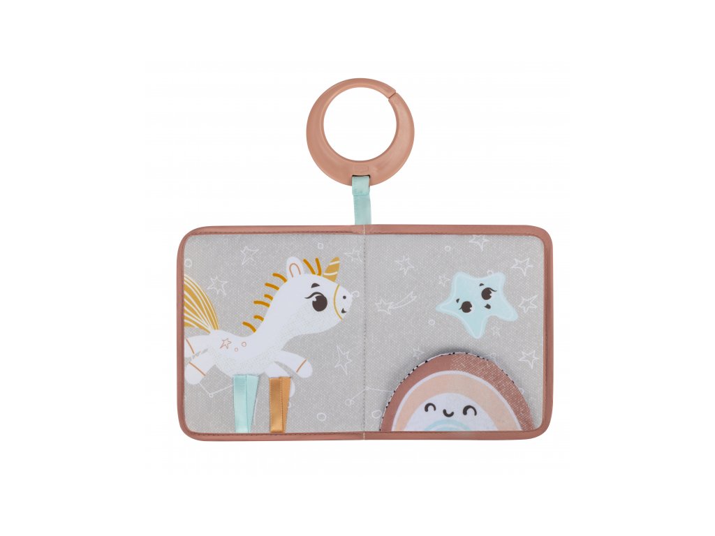 Knížka je ideální na doma i na cesty – snadno ji s pomocí závěsného kroužku připevníte ke kočárku, autosedačce nebo hrazdě na hrací dece.