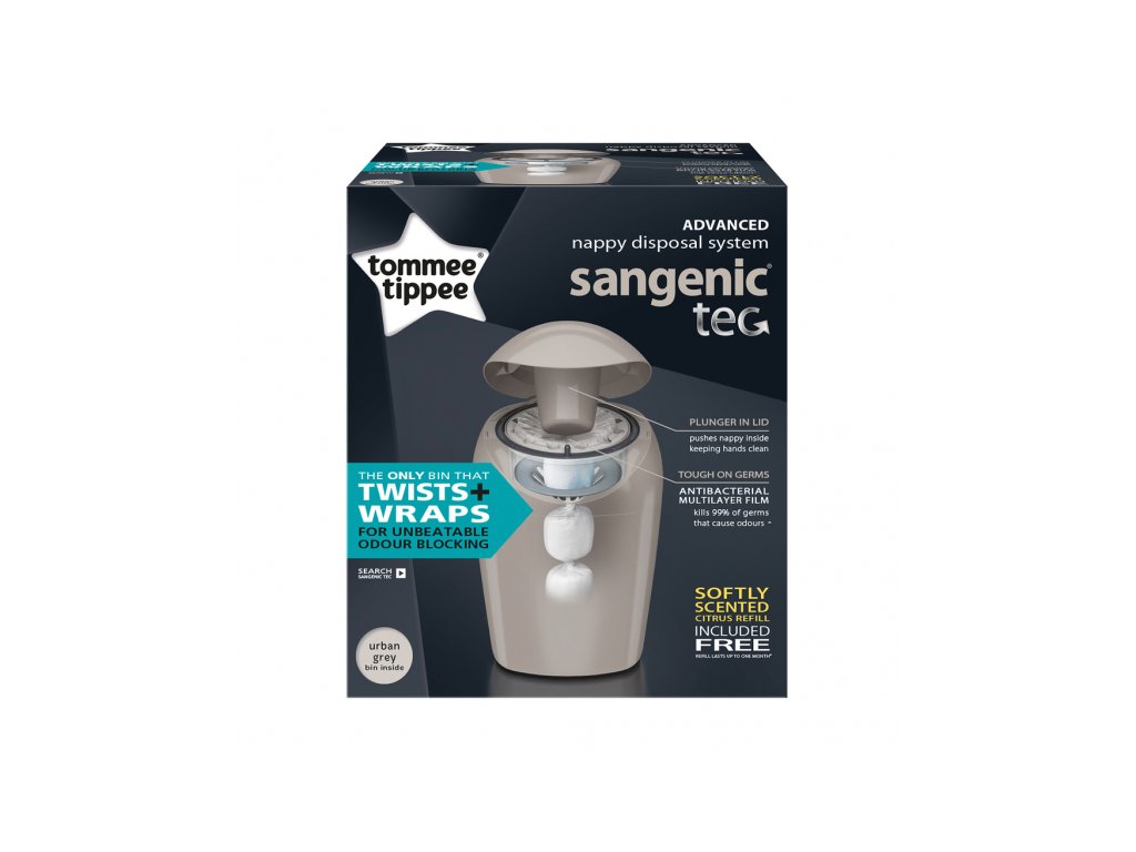 Designový koš na jednorázové pleny Sangenic Tec umožňuje bezdotykové zabalení použitých plen. Součástí koše je výměnná kazeta s antibakteriální fólií, jejíž antibakteriální složka zničí 99% baktérií. Koš tak chrání dětský pokoj před zápachem i bakteriemi. Díky technologii TWIST-LOCK se plena v koši zabalí do voňavé fólie a s pomocí pístu je zatlačena do koše. Kapacita jedné kazety je až 84 plen (vel. 5–9 kg), při spotřebě 3 plen denně tak jedna kazeta vydrží až jeden měsíc používání. Díky tomu, že koš pojme cca 28 plen (vel. 5–9 kg), není potřeba jej často vynášet. Špičkový design koše skvěle doplní váš moderní interiér.