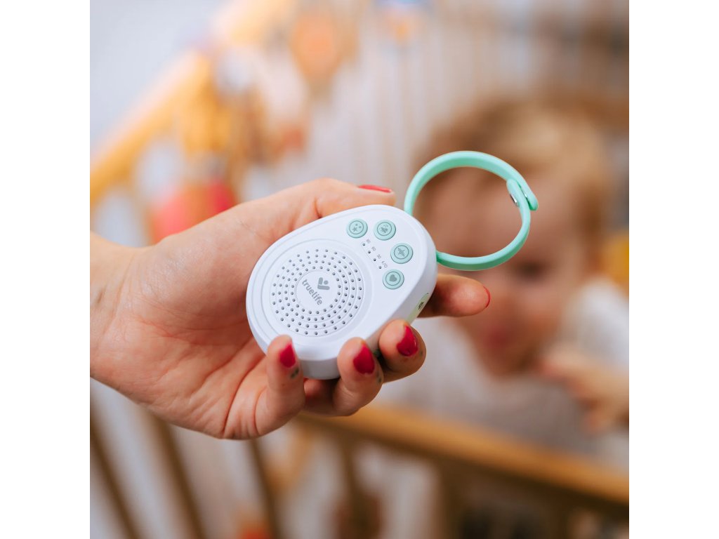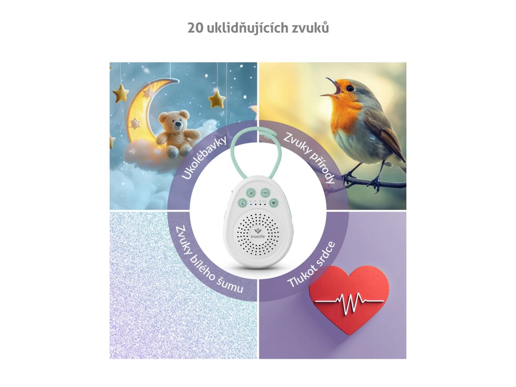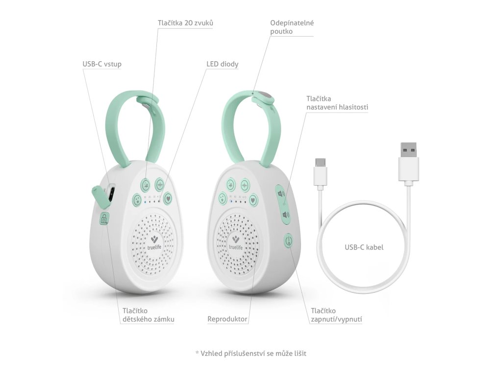 Přenosný uspávací modul TrueLife BabyTone S3, 20 různých zvuků, baterie až 100 hodin, časovač, odnímatelné poutko, dětský zámek, z nezávadného plastu, kvalitní reproduktor, nastavení hlasitosti, paměť, přehrávání ve smyčce, USB-C