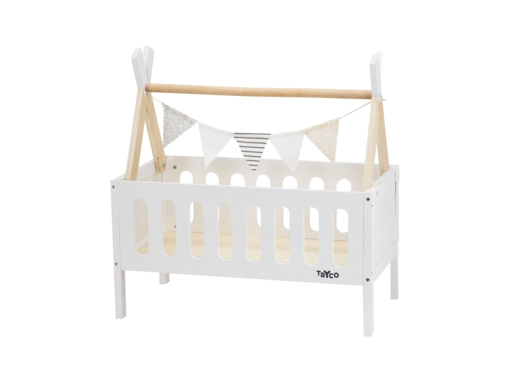 Postýlka má konstrukci jako týpí, na které jsou zavěšené vlaječky. Do této postýlky se vejdou panenky do velikosti 48 cm.