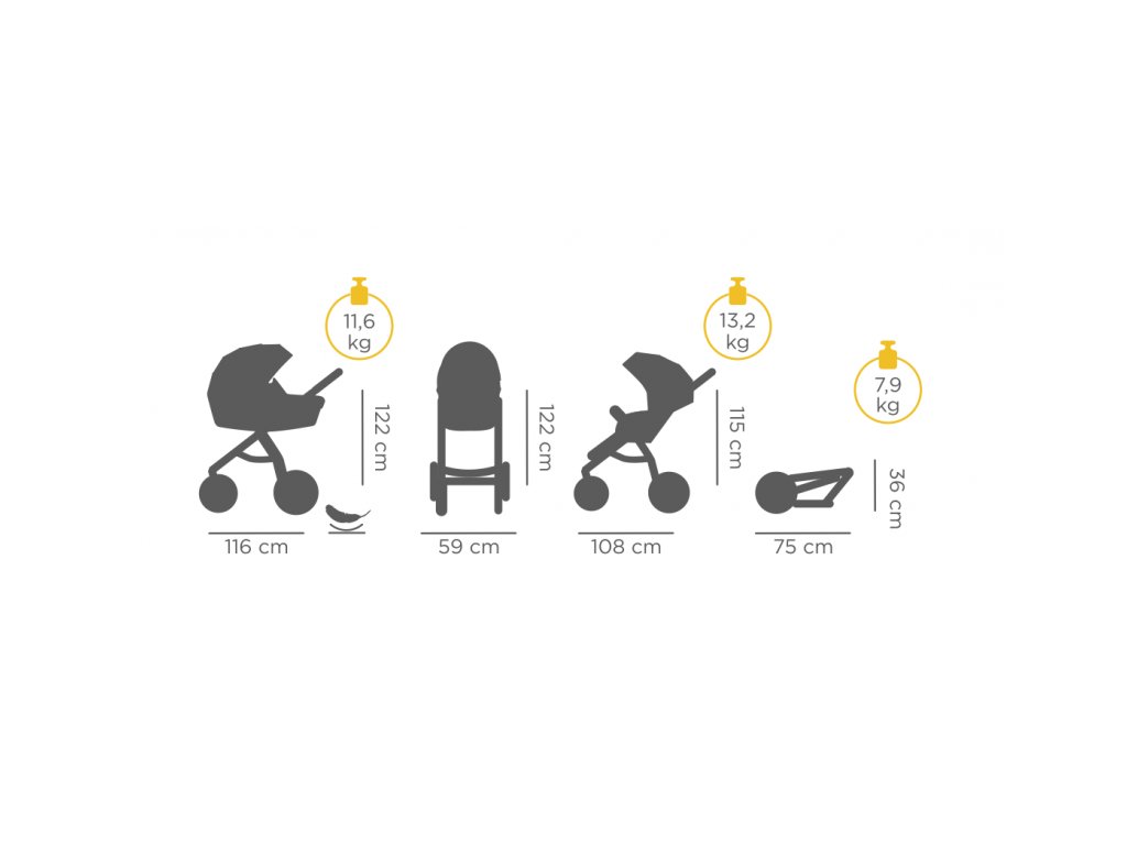 Součástí kočárku je podvozek, sedák, korbička, stříška a nánožník pro korbičku a sedák, 5-bodové bezpečnostní pásy, madlo, matrace, přebalovací taška, nákupní košík, držák nápojů, pláštěnka a síťka proti hmyzu.
