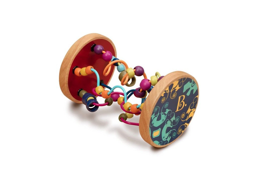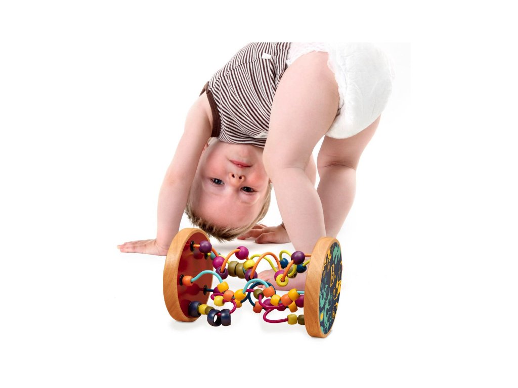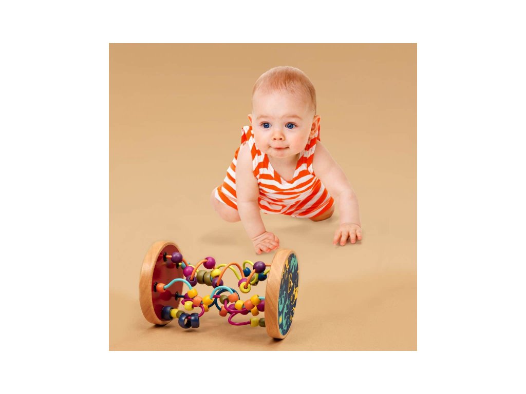 48 barevných dřevěných korálků na pěti drátěných drahách se pohybuje při otáčení hračky nebo je dítě posunuje svými prstíky.