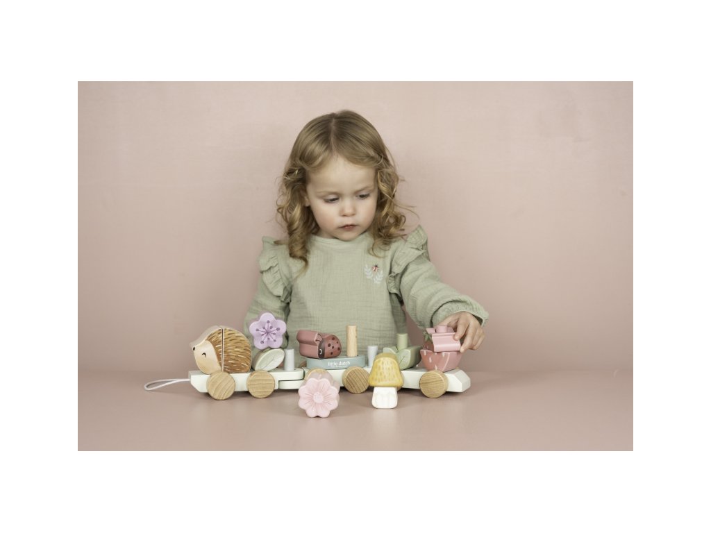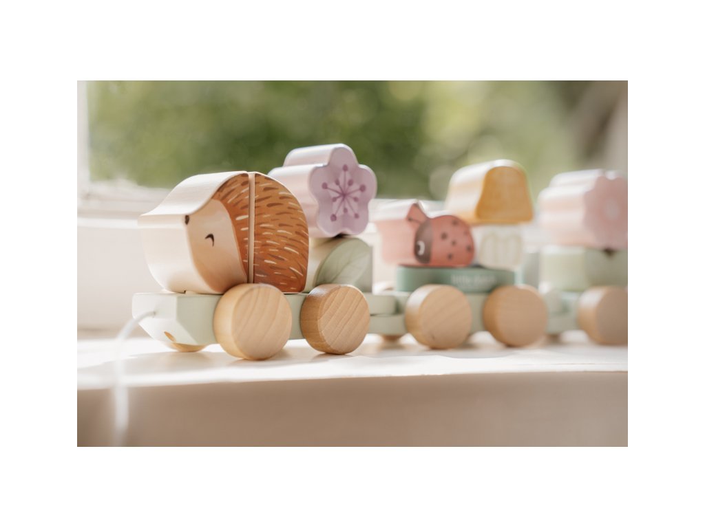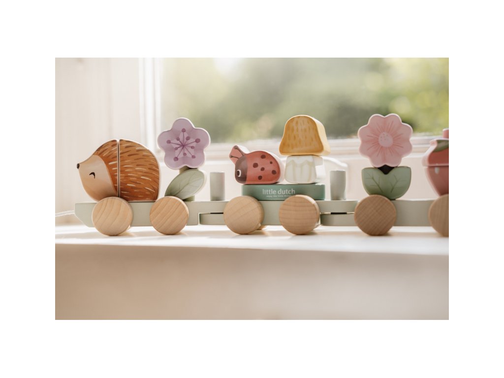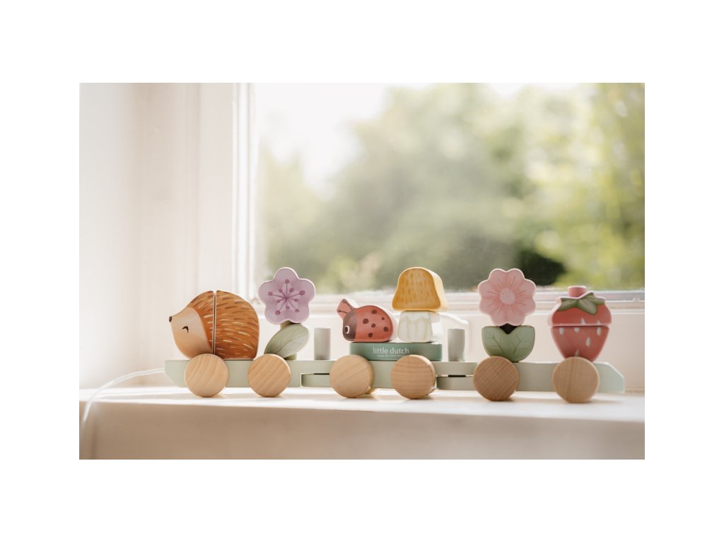 Originální dřevěný vláček z dílny Little Dutch je tvořen kostkami různých barev ve tvaru ježka, berušky, houby, květin a jahody. Kombinováním kostek si vaše dítě může sestavovat různé varianty vagónů dle své fantazie.