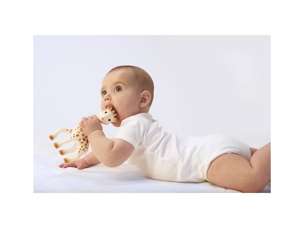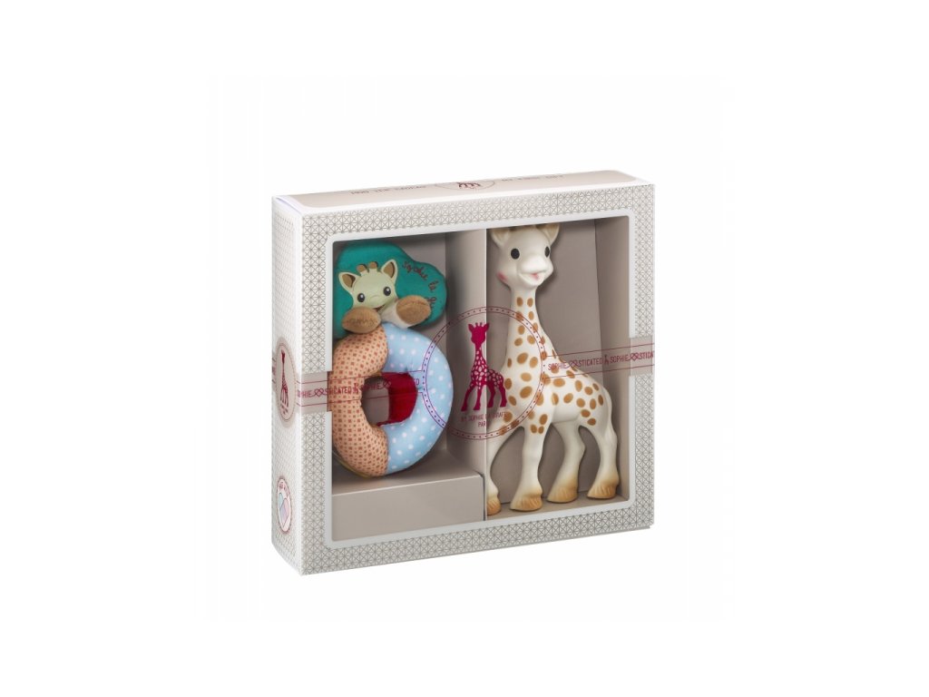 Krásný dárkový set žirafy Sophie 100% přírodního kaučuku a chrastítka! Set obsahuje: hračku žirafa Sophie měkké chrastítko s korálky kolekce ''Sense & Soft'' dárkovou...