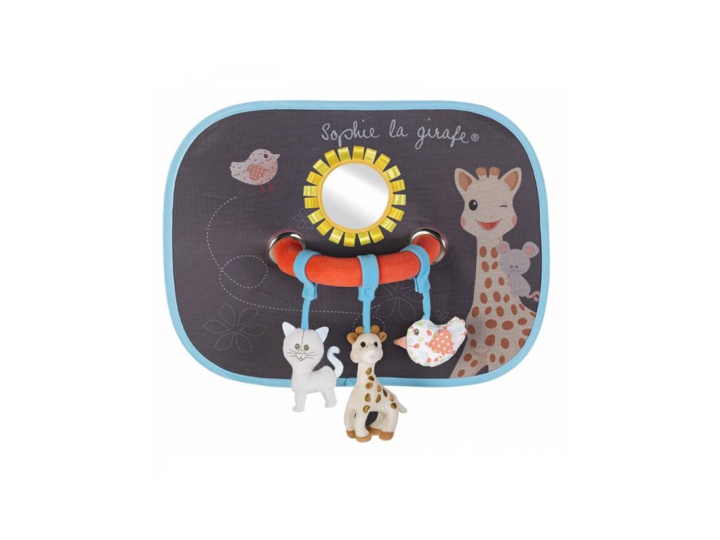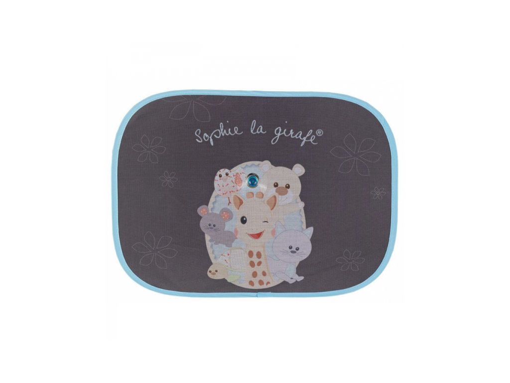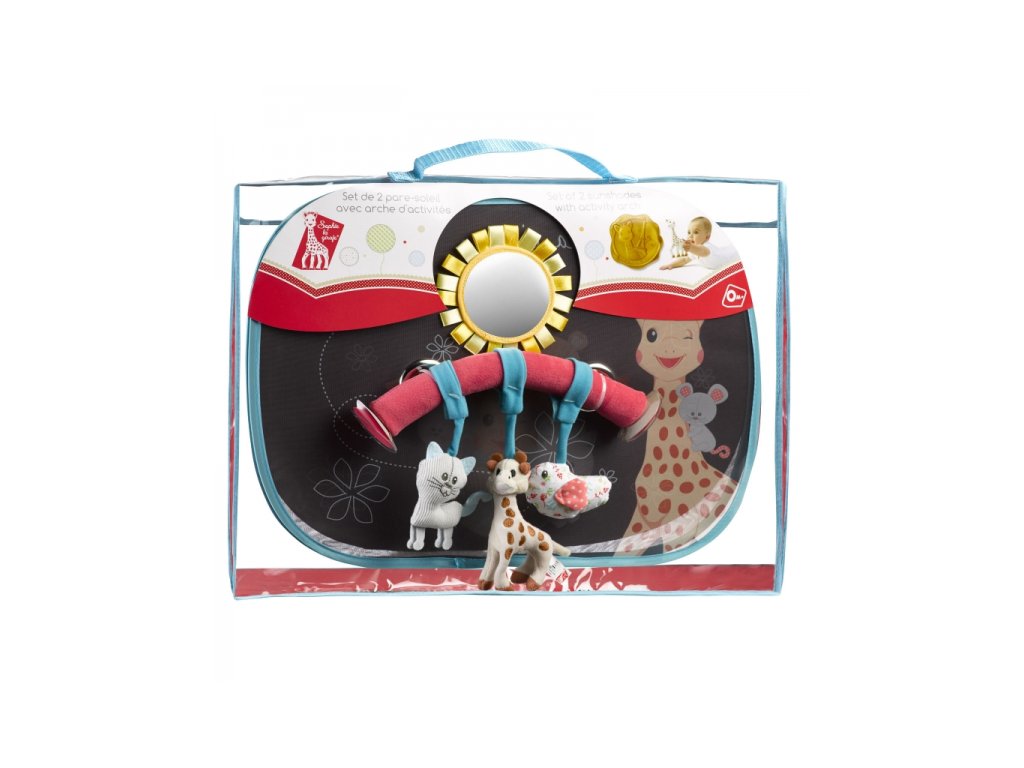 Sada obsahuje stínítko s hrazdičkou pro pobavení dítěte během jízdy a stínítko s motivem žirafy Sophie.