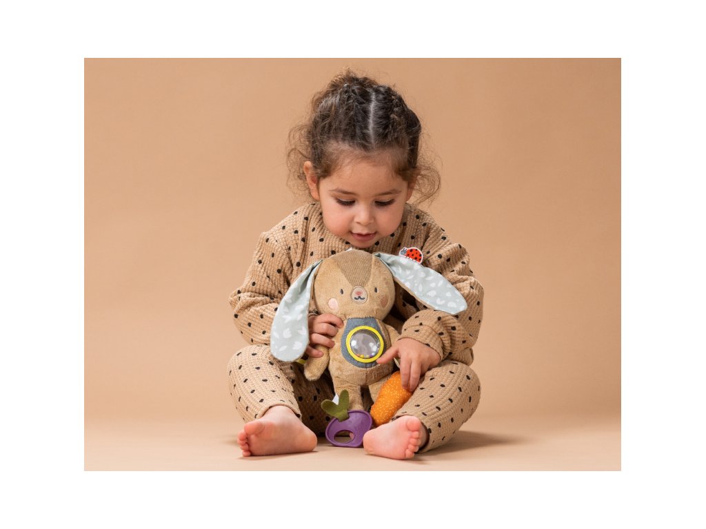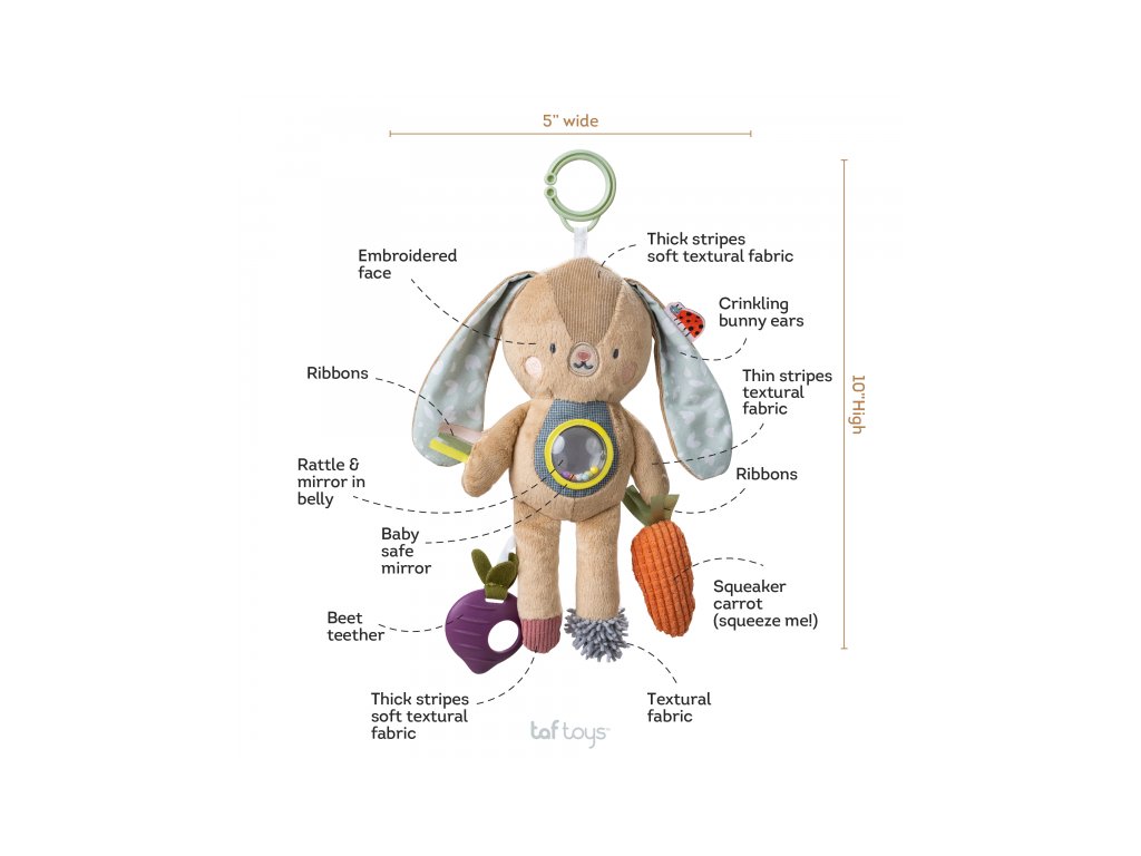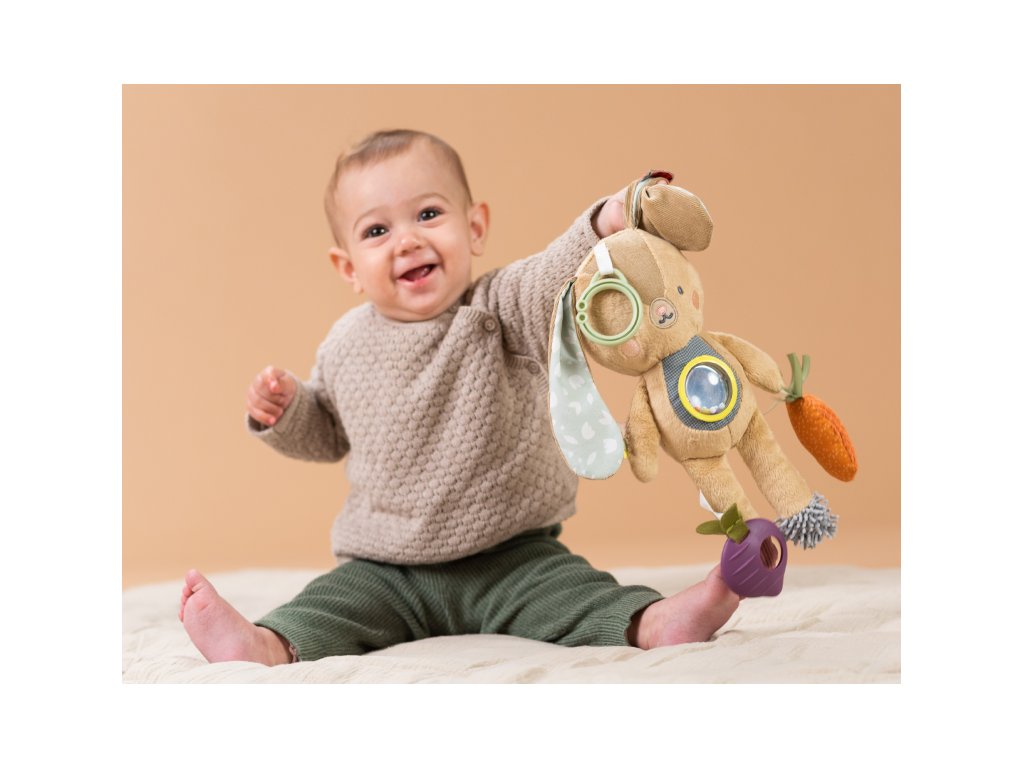 Hračka v podobě roztomilého králíčka Jenny se snadno zavěsí na postýlku, kočárek, autosedačku apod.