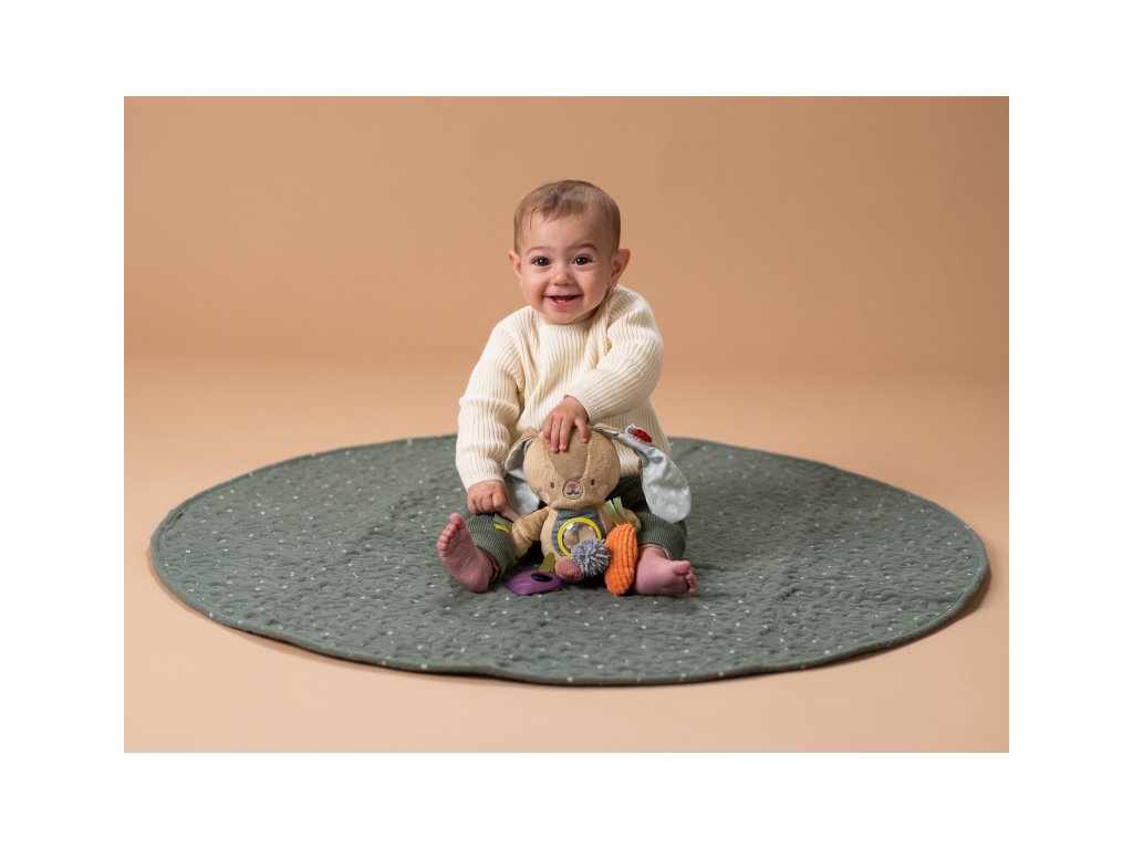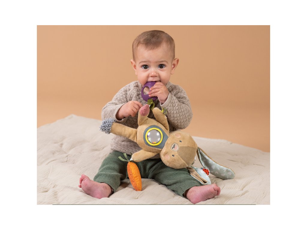 Hračka chrastí, šustí a nabízí různorodé textury i kousátko pro zkoumání rukama i ústy dítěte.
