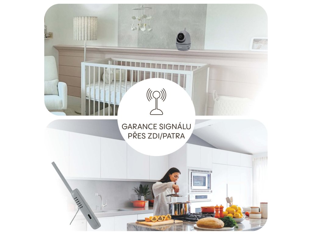 Digitální videochůvička Observatory přináší křišťálově čistý obraz na prostorném LCD displeji s HD rozlišením. Se stabilním signálem, který překoná zdi i patra až do vzdálenosti 300 metrů, budete mít své děťátko pod kontrolou kdekoli v domě, a to i za tmy díky infračervenému nočnímu vidění. Vzdálené ovládání kamery vám umožní sledovat celou místnost jediným pohybem prstu – otáčení o 355° horizontálně a 60° vertikálně spolu s 2–4x zoomem zajistí, že vám neunikne jediný detail. Pro váš klid vás automaticky upozorní při ztrátě signálu nebo při nízké baterii.