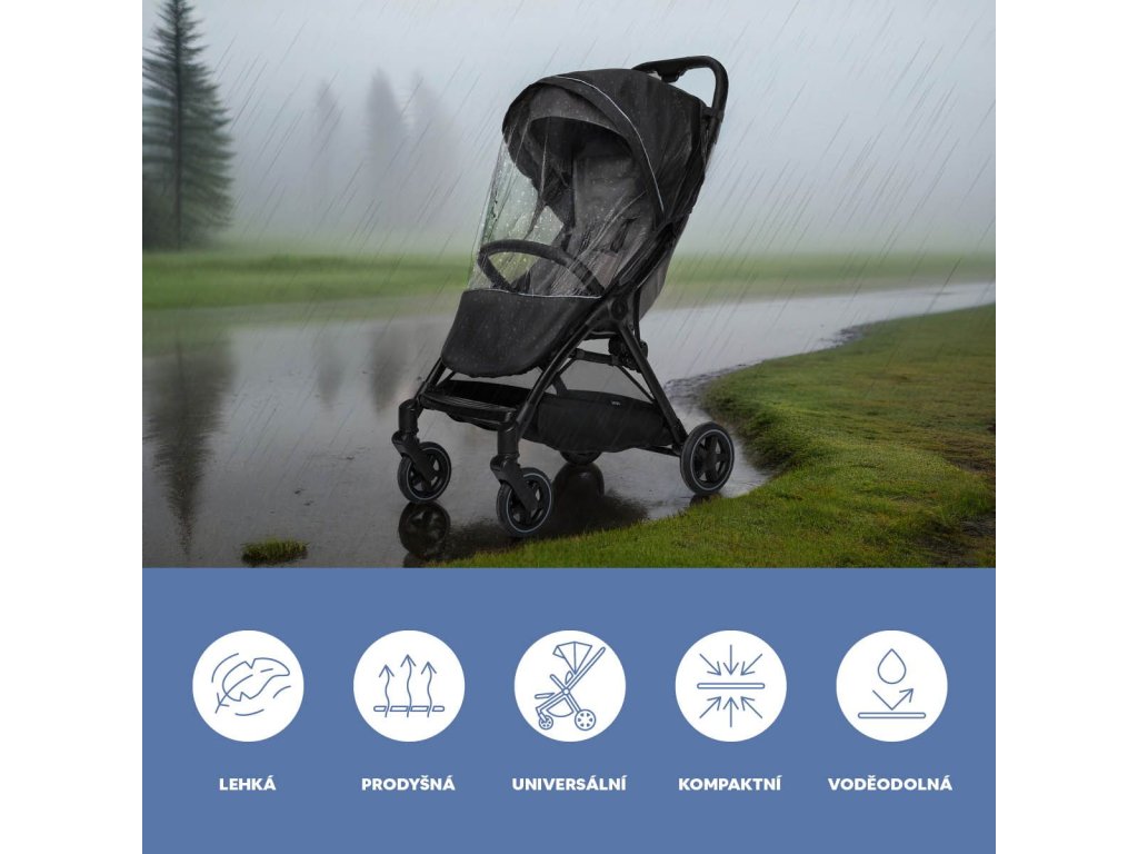 Spolehlivá ochrana proti dešti, větru i hmyzu – pasuje na sportovní sezení i hlubokou korbu. Praktické zipové okénko umožňuje rychlý přístup k dítěti bez nutnosti sundání celé pláštěnky.